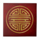This ceramic tile features a Chinese shou character which represents longevity. The symbol is colored in gold on a textured red background.
