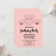 A Chinese new year - Birthday party invitation with a drawing of a cute pink pig's face. Lifted up by his black cloven hooves and peering over a table. Cute and whimsical drawing. Set on a pink background with faded hearts.