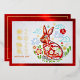“Happy New Year” real gold foil typography in both Chinese and English and a stunning visual of a graphic multi colour cut paper rabbit with flowers, clouds and stars, overlay a traditional light grey circle pattern and brushed red faux foil border on the front. On the back, a cloud and star visual, along with your personal message, overlay a brushed red faux foil background. Feel the warmth and joy of the holiday season whenever you send this stylish yet modern, personalised 2023 Chinese New Year of the Rabbit real gold foil greeting card. Make sure someone special receives this greeting!