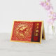 An elegant visual of a horse in red with blossoms into a circle (inspired by traditional Chinese paper-cut) with gold circle (image printed) overlay a red and yellow traditional Asian pattern + graphic "HAPPY NEW YEAR" in Chinese and English and old Chinese calligraphy for "horse" on the right on gradiant red colour band. Inside are the same gradiant background for texts to personalise. Design on horizontal greeting card. You can easily personalise this Lunar New Year folded card by customising the greeting on inside the card or delete for your handwritten note. Available similar design with golden paper cut-out of snake. Matching real foil greeting card.