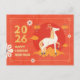 The 2026 Year of the Horse postcard showcases a majestic golden horse galloping across a festive red backdrop. Lanterns and sakura petals float around, creating a postcard that radiates energy and optimism. This Chinese New Year greeting reflects the dynamism of the horse and the cultural richness of the Lunar New Year, making it a perfect keepsake for the holiday.