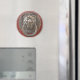 Traditional Chinese bronze doorknob in the shape of a lion head, guarding the gate of a temple