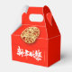 Large wishes "Happy New Year" in Chinese (white modern calligraphy) and in English, Tiger round golden paper-cut (image printed - model n°1). Design on gable favour box with red background + Family name and message to customise. You can easily change text (font, colour, size and position) and background colour by clicking the customise button. Available in other style: tent, cube and take-out boxes and with other tiger paper-cuts.