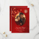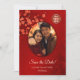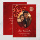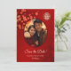 Red cherry blossoms and a red double happiness symbol on a shimmering ruby red background. Save the date text in an elegant script. Customise it with your photo. Matching Chinese wedding products available.