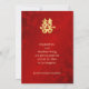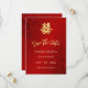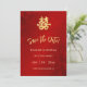 An artistic gold double happiness symbol on a shimmering red floral background. Save the date text in an elegant handwritten script. Matching Chinese wedding products available.