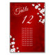 This Chinese wedding seating chart table number cards features pretty white cherry blossoms and a gold double happiness symbol on a shimmering ruby red background. With text boxes to add a list of guest names.