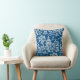 Pagoda design, Chinoiserie style in blue and white on a throw pillow.