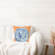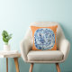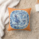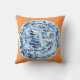 This is a pillow that features a classic blue and white Chinese plate on a tangerine background, an original gouache/ink painting by artist Anne Harwell. Design is on both front and back.
