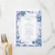 This wedding menu with front floral border has the timeless elegance of a classic blue and white Chinoiserie and striking blossoming tree motif on the reverse. The collection features sophisticated patterns and delicate floral motifs inspired by traditional Chinese porcelain, creating a refined and romantic aesthetic. From beautifully designed invitations to coordinating party supplies and decor, every detail is thoughtfully crafted to bring a sense of grace and charm to your special day. Personalise each piece with your details for a truly unique wedding experience. Search ID1094 to see all the coordinating products in this collection.