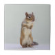 Photo of a chipmunk standing up on its hind legs with its front paws close to its chest. You can see the chippie's striped back and fluffy tail. The background of the photo is white. This is a closeup chipmunk picture that can be easily customised and printed on many different photo products.