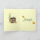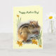 This Mother's Day card features a cute little chipmunk who is stuffing his chubby cheeks as fast as he can on a spring day. He has a black and white stripe down his back, white around the eyes, golden brown fur, and a pink nose. The sweet little critter is surrounded by green grass and yellow lilies. He also appears inside the card along with more lilies. The text can be customised to suit your needs.