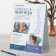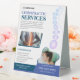 Utilise both sides of the table tent to display different information, such as a list of services on one side and special offers or wellness tips on the other.
