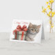Watercolor artwork of a cute kitty with a red Christmas bow on a gift box.