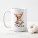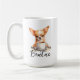A morning coffee mug with a fierce chiwawa dog with custom name in script style. "May your Coffee be stronger than your dog's Attitude" is written on the back. Perfect gift for dog owners that have a dog with an attitude and also love coffee.