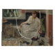 This design features a painting by the English artist Sir Edward John Poynter (1836–1919), who served as President of the Royal Academy of Arts. It depicts a beautiful woman named Chloe who is seated in an elegant portico surrounded by ancient-Roman architecture. She is holding a pair of woodwind musical instruments, like flutes, in one of her hands, and she is holding cherries in the other hand to tempt a small bird that is perched nearby. Chloe is wearing a long flowing toga-like dress and she has green sandals on her bare feet. She has neat brunette hair and she is wearing a colourful necklace. The architecture that surrounds her is painted in all kinds of beautiful colours. There are some tall flowers, including foxgloves and poppies, growing in the garden outside. The coast and the sea can be seen in the distance. The original artwork was painted by Edward Poynter in 1893.