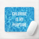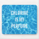Chlorine is my perfume is text in white on a beautiful sparkling blue, clear pool water.