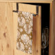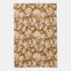 Kitchen towel in a pattern of chocolate brown, tan and creamy white semi-abstract sea shells on a milk chocolate brown background