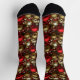 Socks in a pattern of Christmas ornaments, with a frosted texture, in shades of chocolate brown and deep, ruby red, accented with silver and white