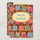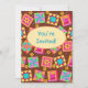Invite a quilter or quilt lover with this colourful fully customisable quilt invitation. Fully customise on the front and back to add your own words, names and other information. This original quilt art makes a vibrant invitation. Quilt art based on original art features favourite patchwork quilt blocks plus unique blocks in vibrant and dynamic colours of orange, yellow, pink, turquoise, and lime green on a chocolate brown background for a beautiful colour palette. A sunny yellow oval is on the front of the card to say "You're Invited" or other words of your choice. Show your love of quilting with these quilt art designs with other quilt art products. Quilt art is original art from fabric and quilt designer Phyllis Dobbs and is in a fabric collection from Quilting Treasures. This art is available on other products and in several colour backgrounds. More products are available in Phyllis' BusinesswithFlair store. Match with coordinating stamps, envelopes, stickers and return address labels.