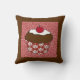 Chocolate fudge cupcake topped with a cherry, in a decorative, red and white cupcake wrapper, on a red and white, Japanese swirl patterned background throw pillow