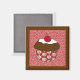 Magnet as a Chocolate fudge cupcake topped with a cherry, in a decorative, red and white cupcake wrapper, on a red and white, Japanese swirl patterned background