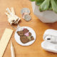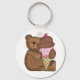 An adorable teddy bear sitting down and clinging to his giant ice cream cone with a scoop of chocolate ice cream and a scoop of strawberry.