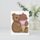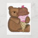 An adorable teddy bear sitting down and clinging to his giant ice cream cone with a scoop of chocolate ice cream and a scoop of strawberry.