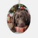 This adorable Christmas ornament, featuring a Chocolate Labrador Retriever lying under a Christmas tree, is a wonderful gift for any Chocolate Lab lover.