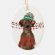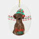 A chocolate Labrador Retriever wears a red and green Santa Claus hat in front of strings of red and green Christmas beads on both sides of this ornament. At the bottom are two text fields in matching red and green for your own text. The back has the same image with a third text field in red. Perfect for anyone who is owned by a Lab!