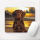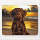 A chocolate Labrador Retriever sits on a sandy beach, gazing intently at the camera. The dog's fur is a rich brown, contrasting with the golden hues of the setting sun. The sky is ablaze with vibrant orange and pink clouds, reflecting in the wet sand. The ocean waves gently lap at the shore, creating a tranquil and serene atmosphere. Ideal gift for labrador lovers.