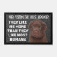 Custom dog doormat with a funny quote. "They like me more than they like mot humans." It has a non-slip rubber that won't crack or buckle,  resists fading, mould, and mildew and can be easily cleaned with a hose. Be creative - click on CUSTOMIZE to add/remove/change text, change the picture, resize the picture, change colours, background or anything else the customisation tool will allow!