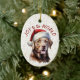 On the front of this Holiday ornament is a beautiful image of a chocolate brown Labrador Retriever dog in a Santa Claus hat. Behind the image is a gold confetti sprinkle background. Red text says "Joy to the World". The back of the ornament has the same confetti background and text fields for you to personalise each ornament.