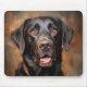 A close-up portrait of a Chocolate Labrador Retriever, painted in a realistic style. The dog has a friendly expression, with its tongue slightly sticking out and its brown eyes looking directly at the viewer. The fur is rendered with meticulous detail, showcasing the texture and depth of the animal's coat. The background is a soft, blurred brown, creating a sense of depth and focus on the dog's face. Perfect gift for labrador lovers.
