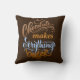 "Chocolate makes everything better" declares the stylised text on both sides of this pillow. Text colours include light brown, gold, and light blue.