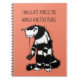 Chocolate lover notebook with the customisable text "Chocolate makes the world a better place". It's great for a cat lover because it has a funny ink illustration of a weird cat character who loves chocolate over customisable yellow background. You can tell by the striped kitty’s drool falling on the block of delicious sweet miracle which it is holding.