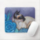 Original watercolor painting by Sandra Gale, featuring a chocolate point Siamese cat, surrounded by blue flowers on a pale purple background. Flowers are blue hydrangea, and blue poppies and a blue rose. Great design for cat lovers and those who especially like the Siamese breed. Perfect for bedroom wall art or framed with matching image. Matching watercolor painting of a blue point Siamese also available.