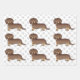 Destei's original cartoon illustration of a cute long hair chocolate brown and tan coat colour Dachshund breed dog. The dog design is placed nine times on each sheet. The background has a pattern of grey dog paw prints.