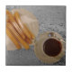 A cup of thick, rich chocolate served with churros, crunchy on the outside and soft on the inside. One of the most delicious snacks in the world. Found along the streets and in the cafes of Spain as well as many places in Latin America. Shown here with the background of a pounded metal counter at a local coffee shop.