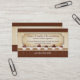 This business card for a chocolatier, chocolate factory or retail shop elegantly displays the fruits of a chocolatier's labour by featuring a row of delicious-looking homemade chocolates displayed on a counter. A business name, description and address is highlighted in a plaque on top of a cream striped patterned background. Add a phone number or a website under the counter against the damask pattern. The reverse reveals additional contact information and a tagline or description against the same striped wallpaper bordered by the chocolate brown diamond border on top and the damask pattern below. Available with matching products.