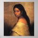 Portrait of a young Choctaw woman her body turned to the left, her head turned back to the front, and her gaze directed towards the viewer. She wears a pair of earrings and an off-the-shoulder garment made of animal skin. Her long dark hair is parted in the middle and falls down over her back, Oil on canvas, 30 x 25 in. Painted by P. Romer