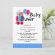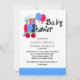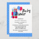 Colourful baby boy's baby shower invitation, with cute graphics of a red, blue, green and yellow choo choo train, with polka dot balloons, and a blue and white polka dot accent band, across the bottom. Graphic text reads Baby Shower, at the top. Personalise the custom black text to suit your shower needs. Matching products are available.