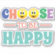Fun design that says Choose in colourful letters and two yellow happy faces where the O should be, To Be in orange text and Happy in a teal text.