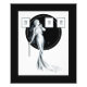 This is an elegant and glamourous art deco illustration of a young blonde woman (that appears to be Betty Davis), in two piece white silk evening dress that flow all the way to the floor trailing her feet by about a yard.