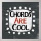 "Chords Are Cool" is a cute text design in grey with black and red text, along with a white accent shape and white textured whimsical dots surrounding it.