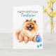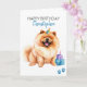 Happy Birthday with a personalised name. A cute Chow Chow puppy dog illustration with a birthday hat and balloons. Add your own message for a personal unique card. Art made with watercolors.