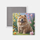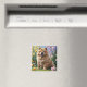 A cheerful dog sits peacefully on lush green grass, surrounded by colourful spring blooms under a soft blue sky. This digital oil painting captures a serene moment with expressive brushstrokes, warm colours, and a sense of gentle joy.