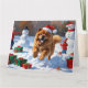 A fluffy Chow Chow runs joyfully through the snowy winter scene, wearing a festive red Christmas hat. This charming design highlights the breed’s thick coat, lion-like mane, and dignified personality while capturing the warmth and spirit of the holiday season. A heartwarming winter moment full of festive charm.