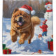 A fluffy Chow Chow runs joyfully through the snowy winter scene, wearing a festive red Christmas hat. This charming design highlights the breed’s thick coat, lion-like mane, and dignified personality while capturing the warmth and spirit of the holiday season. A heartwarming winter moment full of festive charm.