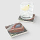 The coasters are gorgeous, a quality feel and heavy weight. They look like a precious archeological find. A rustic stone juxtaposed with a modern floral black and white print. I like the way the print goes slightly imperfect on the cut stone edges giving them a kind-of natural beauty.