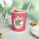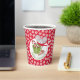 This adorable little mouse is wearing a red scarf with white trim. He has a candy cane in hand and hot beverage. The background is made up of a snowflake pattern over a red background.